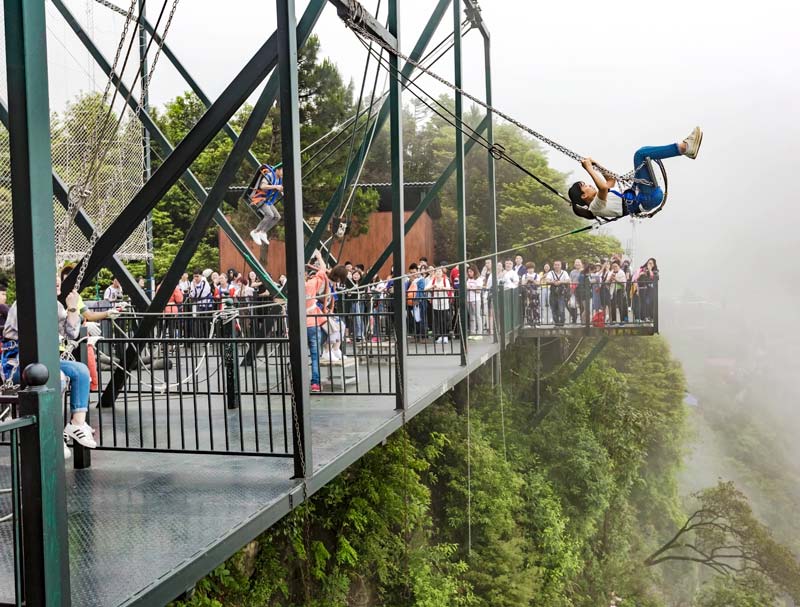 懸崖秋千是一種懸崖邊的極限刺激運動。秋千的座椅,被電吸鐵拉到懸崖內側于5層樓高的地方,吸鐵忽然松開,長長的秋千瞬間向懸崖外蕩去,帶給人以刺激感覺。