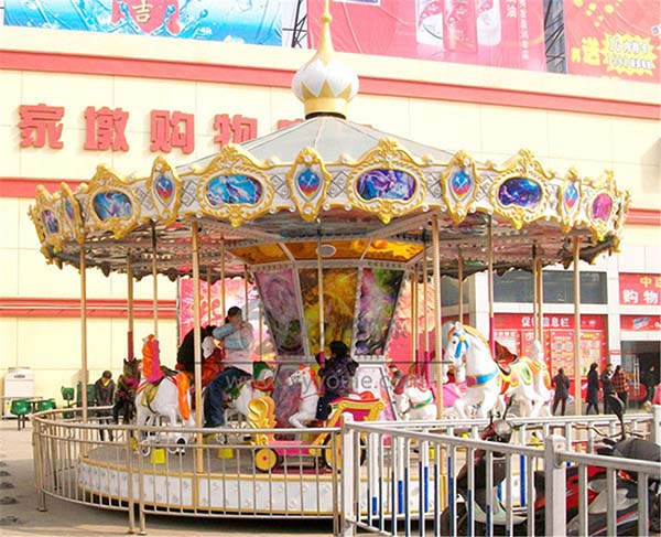 隨著時代的不斷進步,旋轉木馬也在改新換帽,搖身一變成了今天的新型游樂設備豪華轉馬,豪華轉馬擁有富麗堂皇的外觀,精美華麗的裝飾內涵,磅礴的氣勢,絢麗的燈飾和高貴典雅的造型,像是一頂旋轉的皇冠。當絢爛的彩燈開放之后,與城市的霓虹燈伴舞,與星空交相輝映,讓五彩繽紛的童話世界新增多彩。當上下兩層旋盤正反方向旋轉的時候,游客坐在形態各民的動物上奔騰跳躍,讓你瞬間的夢想向無窮的天際放飛。
